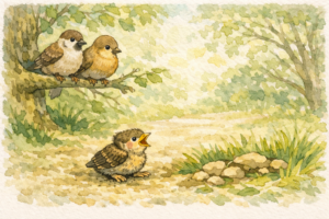 - Junge Vögel am Boden (Ästlinge): „Dieser kleine Vogel übt schon fürs Fliegen. Er hat schon Federn und hüpft. Seine Eltern füttern ihn weiter – auch hier am Boden.“ Ästlinge verlassen das Nest, bevor sie perfekt fliegen können. Sie piepsen, und die Eltern bringen Futter.