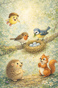 Die Vögel singen lauter, weil das viele Licht ihnen sagt: Es ist Zeit, ein Nest zu bauen. Ihr Gesang ist wie eine fröhliche Einladung: “Hier bin ich, hier ist mein Zuhause!” Viele Vögel sammeln Zweige, Halme und weiches Material, um sichere Nester zu bauen. Warum ist das wichtig? Weil aus den Eiern bald Küken schlüpfen, die gefüttert und gewärmt werden müssen – ein wunderbarer Teil des Kreislaufs im Wald. In Aufregung im Eichenwald flattern Vogelfreunde an Tobis Seite und zeigen, wie schön Vielfalt klingt, wenn alle zusammen harmonieren. Auch ohne Jahreszeiten-Thema spürst du beim Vorlesen die Lebendigkeit des Waldes.