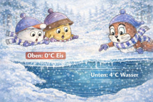Am Ufer eines Sees würde Tobi staunen: „Oben ist alles hart und glatt – aber darunter schwimmt noch Wasser!“ Das ist eine Besonderheit von Wasser: Wasser ist bei 4 °C am schwersten. Wenn es sehr kalt wird, verwandelt sich Wasser in Eis. Und Eis ist leichter als flüssiges Wasser – deshalb schwimmt es oben. Das Eis bildet eine Art Deckel. Darunter bleibt das Wasser etwas wärmer und schützt Pflanzen und Tiere, die dort leben.